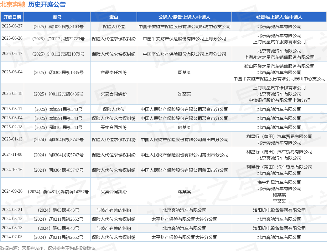 你的位置:雷竞技官网手机版入口 > 新闻动态 > 北京奔驰作为被告/被上诉人的1起涉及保险人代位求偿权纠纷的诉讼将于2025年6月17日开庭本站消息,根据天眼查APP显示,近日公布了一则北京奔驰汽车有限公司作为被告/被上诉人的开庭公告,详细内容如下: